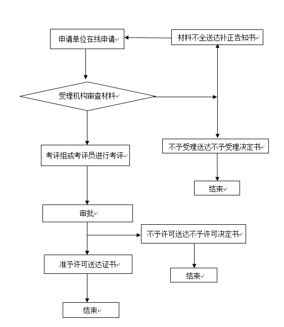 5.发证:主持考核的人民政府计量行政部门根据审批结果,在10个工作日内,向考核合格的建标单位下达准予许可行政许可决定书,颁发《计量标准考核证书》;向考核不合格的建标单位发送不予行政许可决定书。