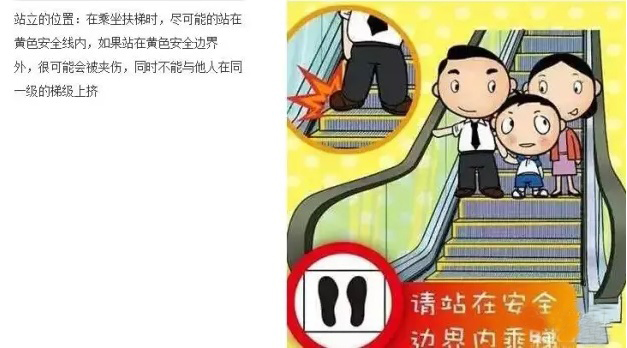 11、不要逆行、攀爬、玩耍、倚靠或争先恐后,前后最好保留一个空位。孩子不能背对着电梯,也不能坐在梯级上,更不能逆向在电梯上奔跑,玩耍。对于年龄比较小的孩子在第一次乘扶梯前,家长要教会孩子第一步如何踏上扶梯,如果发现孩子不能契合扶梯的速度,还是由家长抱着比较好,人多走楼梯更安全。